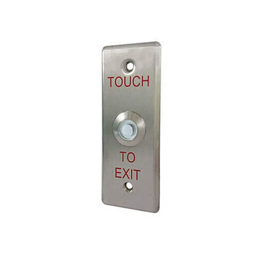 Narrow face plate, stainless steel panel. Unlocking time adjustable 1-60 seconds. 1A/30 DC, 0.3A/125V AC Dimensions: 4.52” X 1.72” X 1.31” (115mm x 43.7mm x 33.5 mm). Touch to Exit Engraved.